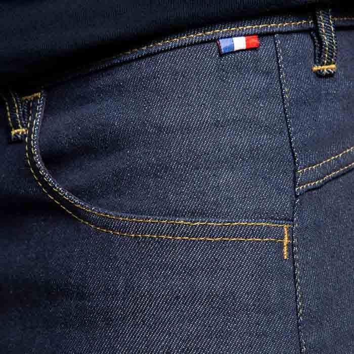 Le modèle est entièrement fabriqué en France. Le bermuda est créé et confectionné dans notre atelier à Nancy, le denim est tissé au Pays basque espagnol, et la coupe est réalisée à Troyes. Ce circuit court garantit une traçabilité complète et valorise le savoir-faire local.
