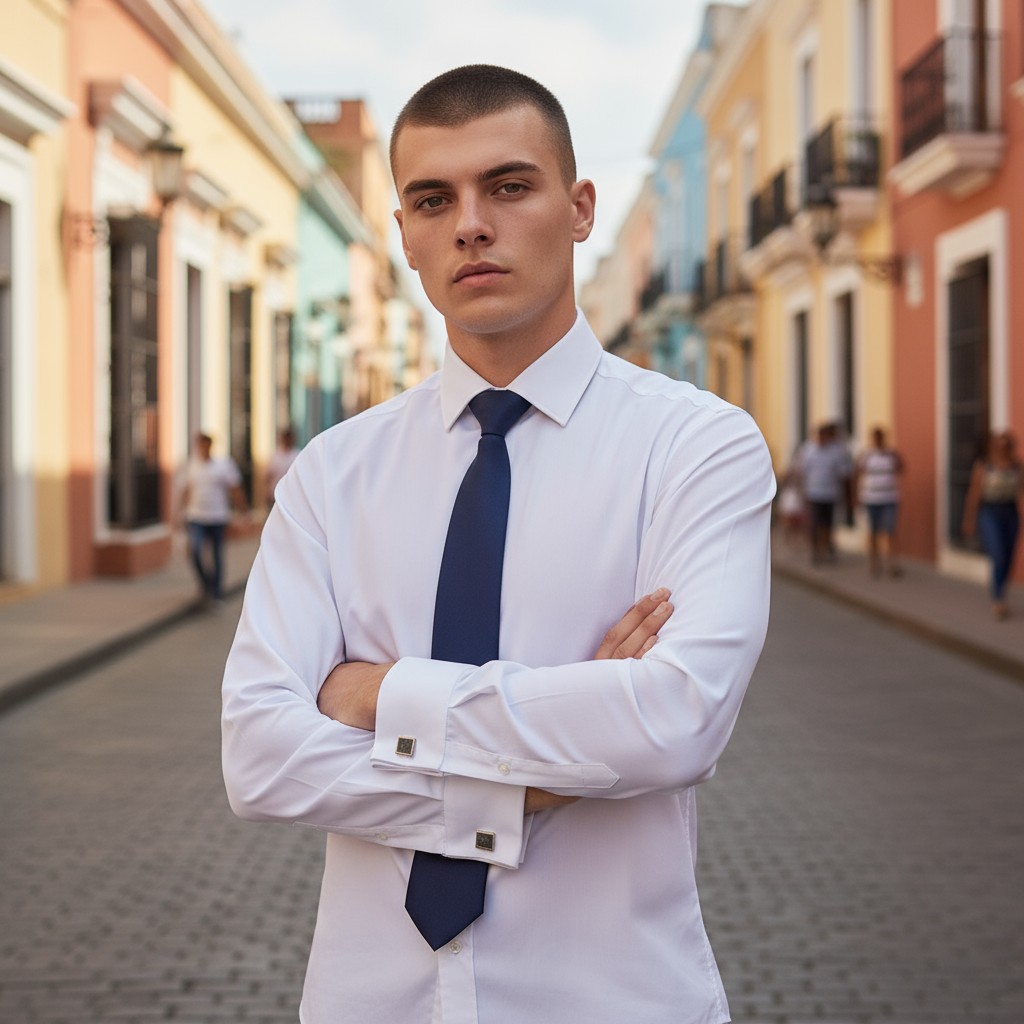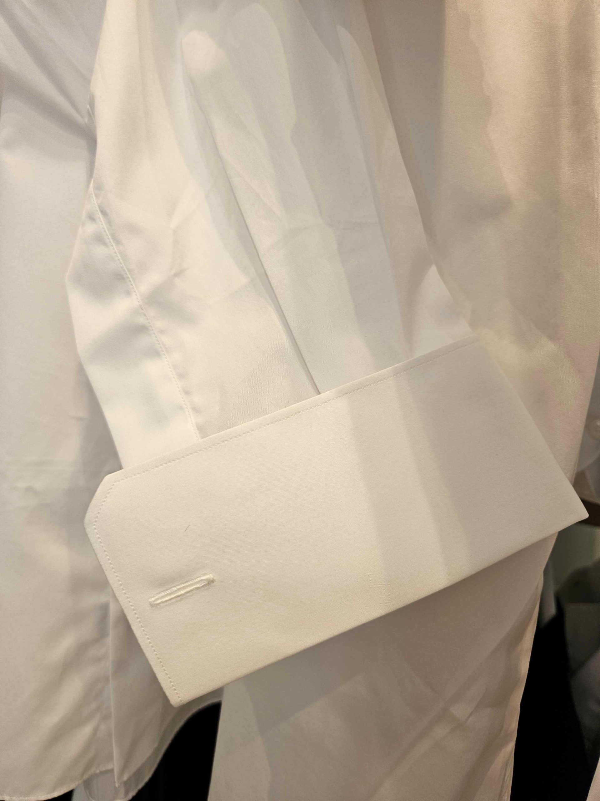 Le col français offre une ligne sobre et chic, parfaite avec une cravate ou un nœud papillon. Les poignets mousquetaire apportent une touche de raffinement supplémentaire et permettent de personnaliser la chemise avec vos boutons de manchette préférés.