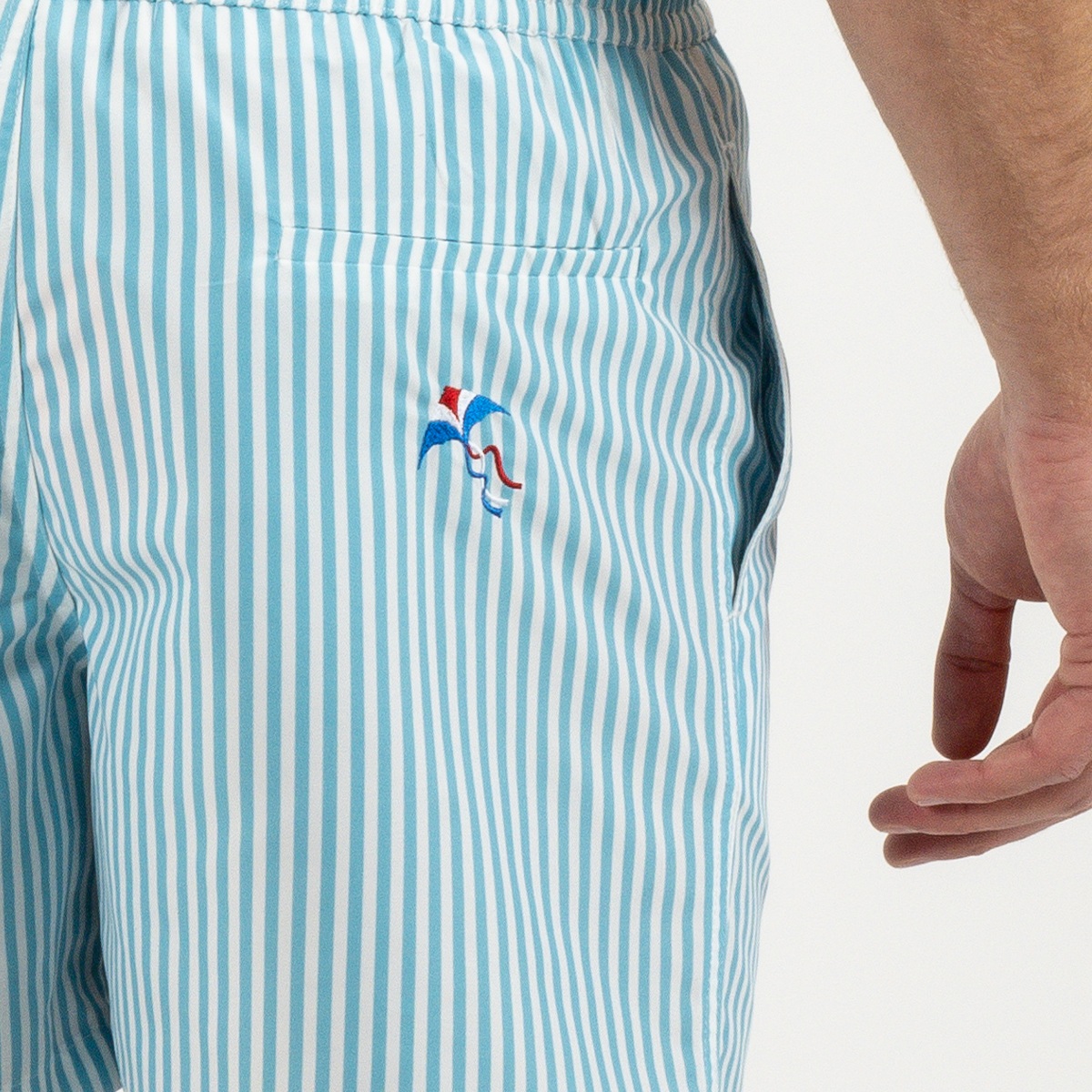 Avec son motif rayé bleu original et sa broderie tricolore en forme de cerf-volant sur la poche arrière, il se démarque sur la plage comme à la piscine. Il offre également un confort optimal, une grande résistance et un séchage rapide, idéal pour profiter pleinement des journées ensoleillées.