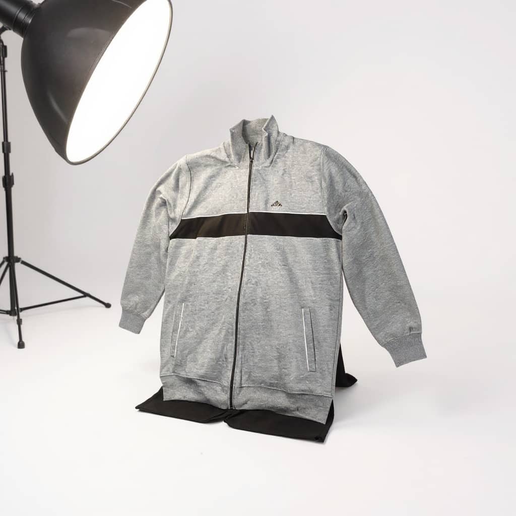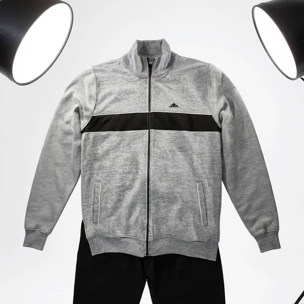 La veste zippée grise se distingue par une bande horizontale noire positionnée au milieu, apportant une touche graphique sobre et structurée.