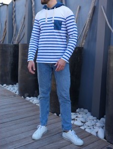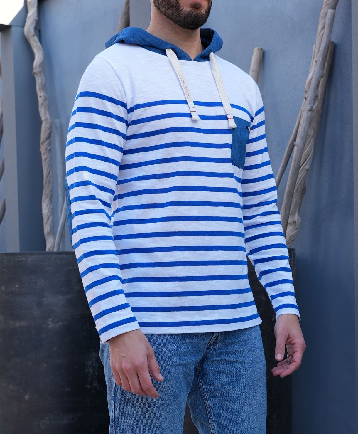 Affirmez un style casual-chic avec le t-shirt JASON à capuche manches longues signé La Marinière Française. Confectionné au Portugal dans un jersey flammé 100 % coton, ce t-shirt offre un confort naturel et une qualité textile premium. Les rayures tricotées dans la maille apportent une touche d’authenticité, tandis que les détails contrastés en chambray sur la capuche, les coudières et la poche poitrine confèrent caractère et originalité à ce modèle.